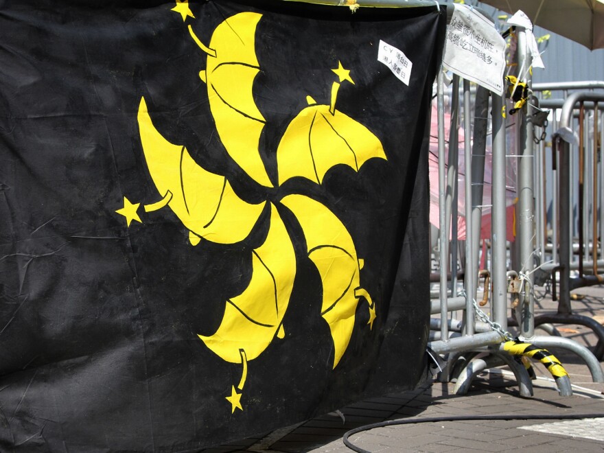 A twist on the Hong Kong flag in which petals of the city's emblem, the bauhinia flower, have been replaced by yellow umbrellas. The five petals on the Hong Kong flag echo the five yellow stars on the Chinese national flag.