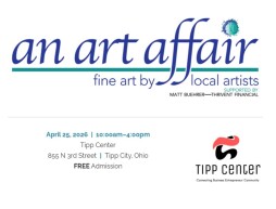 PLEASE NOTE: THE ART AFFAIR Fine Arts & Fine Crafts VENDOR SHOW is open ONLY on SATURDAY, APRIL 25th from 10 AM to 4 PM at the Tipp Center. However, Tipp City Area Arts Council Permanent Art Gallery and A Fine Art Exhibit/Sale will be open to the public April 13th through April 25th from 10 AM to 5 PM daily for viewing. We invite you to stop by the Tipp Center (855 N. 3rd St., Tipp City) to enjoy this amazing exhibition! Many pieces by local artists in the Fine Art Exhibition are on sale and will be available for pick up at the end of the show on April 25th.