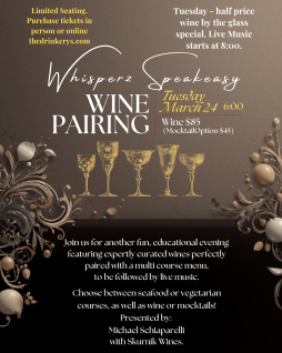 Join us Tuesday, March 24 at 6:00 PM for an evening of great taste and live music. Michael Schiaparelli of Skurnik Wines presents a guided, educational wine-pairing experience featuring expertly curated wines matched to a multi-course menu. Choose a seafood or vegetarian tasting menu and opt for wine pairings or crafted mocktails. After dinner, stay for live music from the Kerry Kennard Trio starting at 8:00 PM. Full menu and pairing details coming soon — reserve your spot and savor the night.